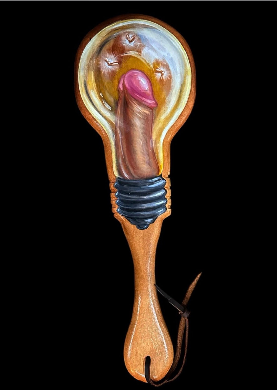 Play with one of our exquisite paddles, expertly hand-painted in oil by the one and only Rhea Adri. Each is a one of a kind masterpiece, hand crafted in exotic wood and sadistic creativity